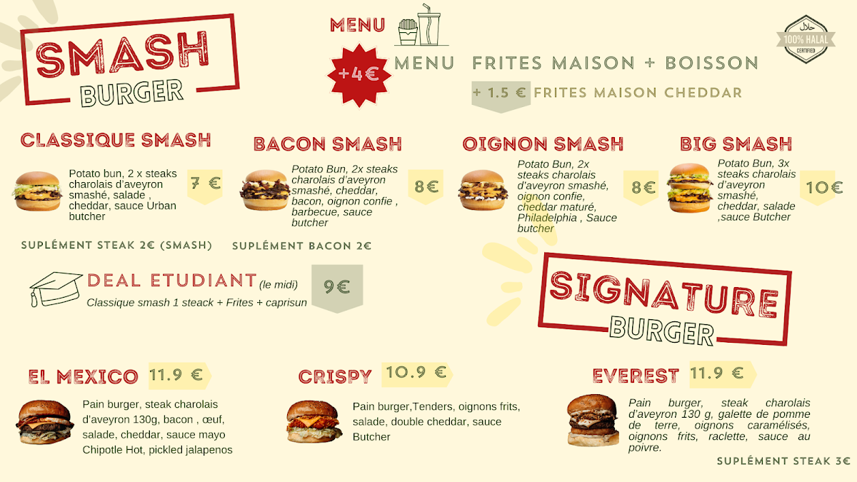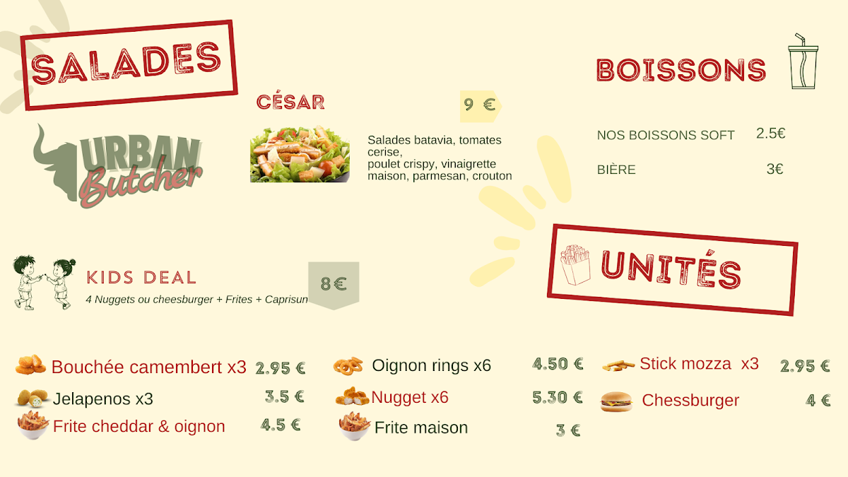 The menu at Urban Butcher focuses on hamburgers, with an emphasis on freshly prepared, classic-style smashed burgers. The selection primarily features a variety of burger options, complemented by side dishes such as fries. Drinks and additional accompaniments may also be available to complete the meal.